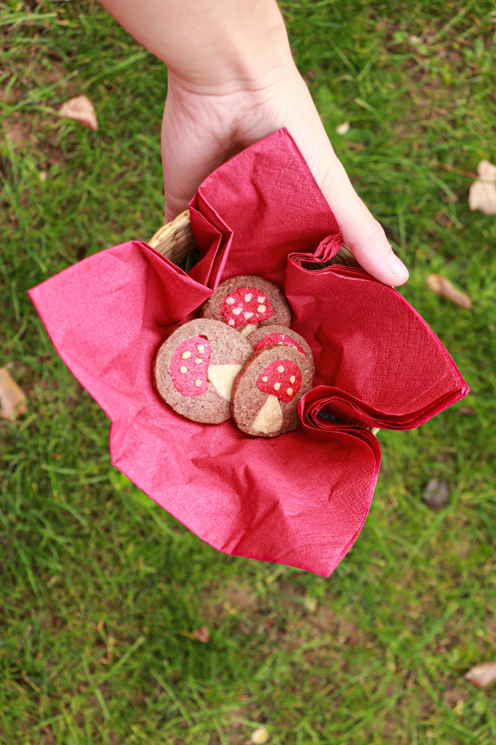 Des champignons fraichement cueillis entourés d'une pâte sablée au cacao.