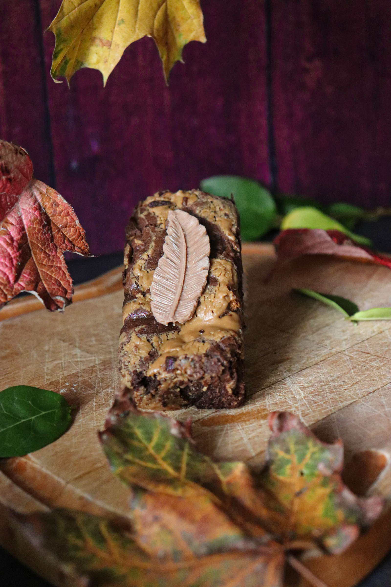 Pâte à brownie bien chocolatée, morceaux de spéculoos, pâte de spéculoos et feuille en chocolat, le gâteau parfait au retour d'une balade en forêt.